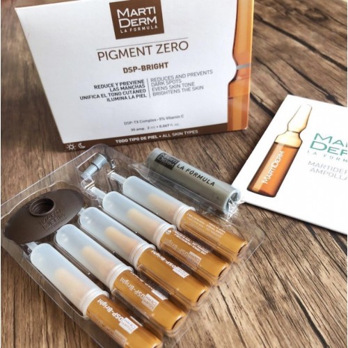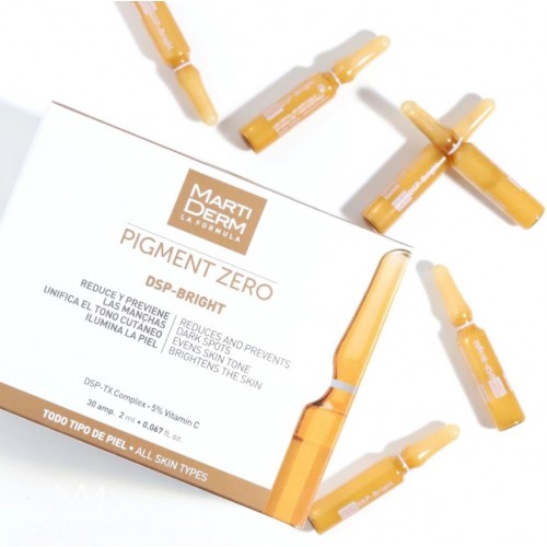 Каждая ампула Pigment Zero DSP-Bright содержит активный комплекс DSP-TX Martiderm . Этот уникальный комплекс включает в себя активные ингредиенты, такие как фитиновая кислота, с антиоксидантным, депигментирующим и профилактическим действием, гексилрезорцин и транексамовую кислоту, которая способна устранять пятна сосудистого происхождения и предотвращать их появление. Для усиления депигментирующего эффекта ампулы содержат чистый витамин С.