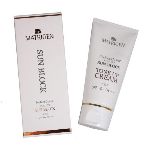 Завершающий крем для лица с высокой SPF 50+ защитой Tone Up CREAM Sun block от Matrigen подходит для любого типа кожи, совмещая интенсивное увлажнение, протектор и регенерирующий эффект. Растительные компоненты проникают в кожу, увлажняя ее, помогает разглаживать мимические морщины.